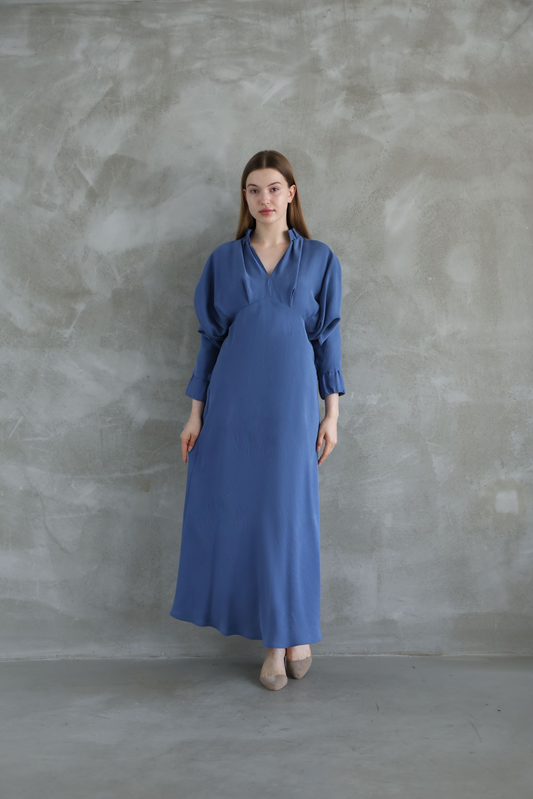 Blue Wrap Dress with Waist Tie and Elegant Collar