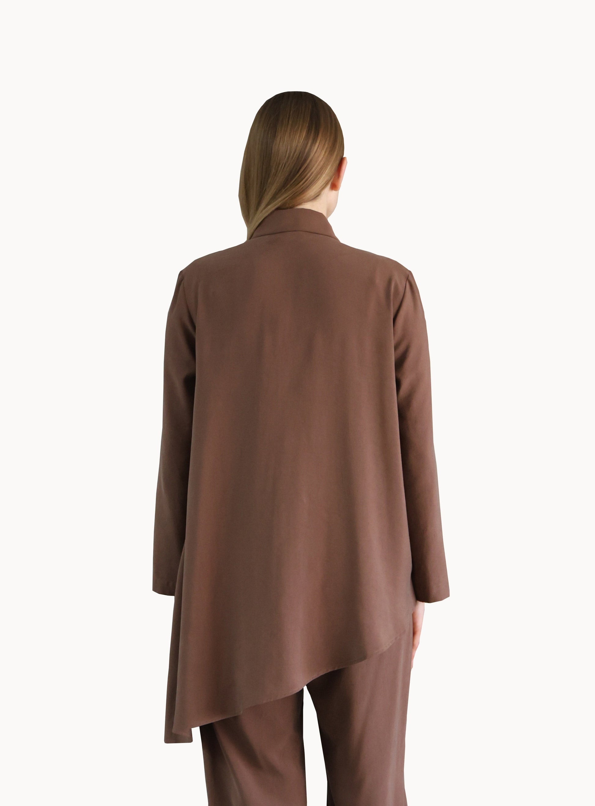The asymmetrical cut design creates a unique and stylish profile, with the viscose fabric adding a modern touch. The shirt has a tailored collar that offers a balance between elegance and comfort.