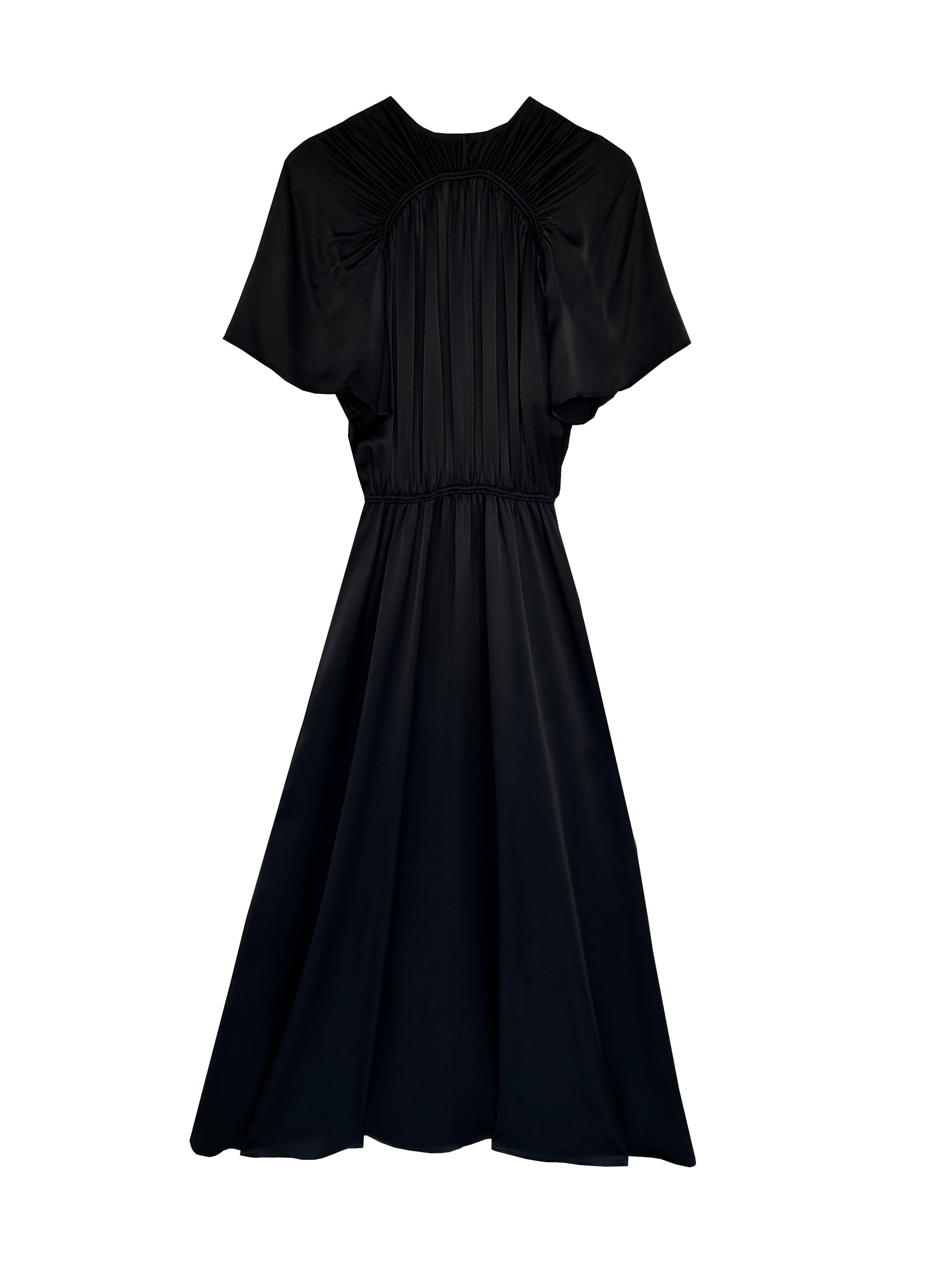This black dress offers an elegant look with its V-neck design and drawstring waist. Its slit design completes your look while allowing for freedom of movement. The soft and lightweight viscose fabric offers comfort and breathability, ensuring all-day comfort. It's the ideal choice for both special occasions and everyday wear, adding a touch of distinction.