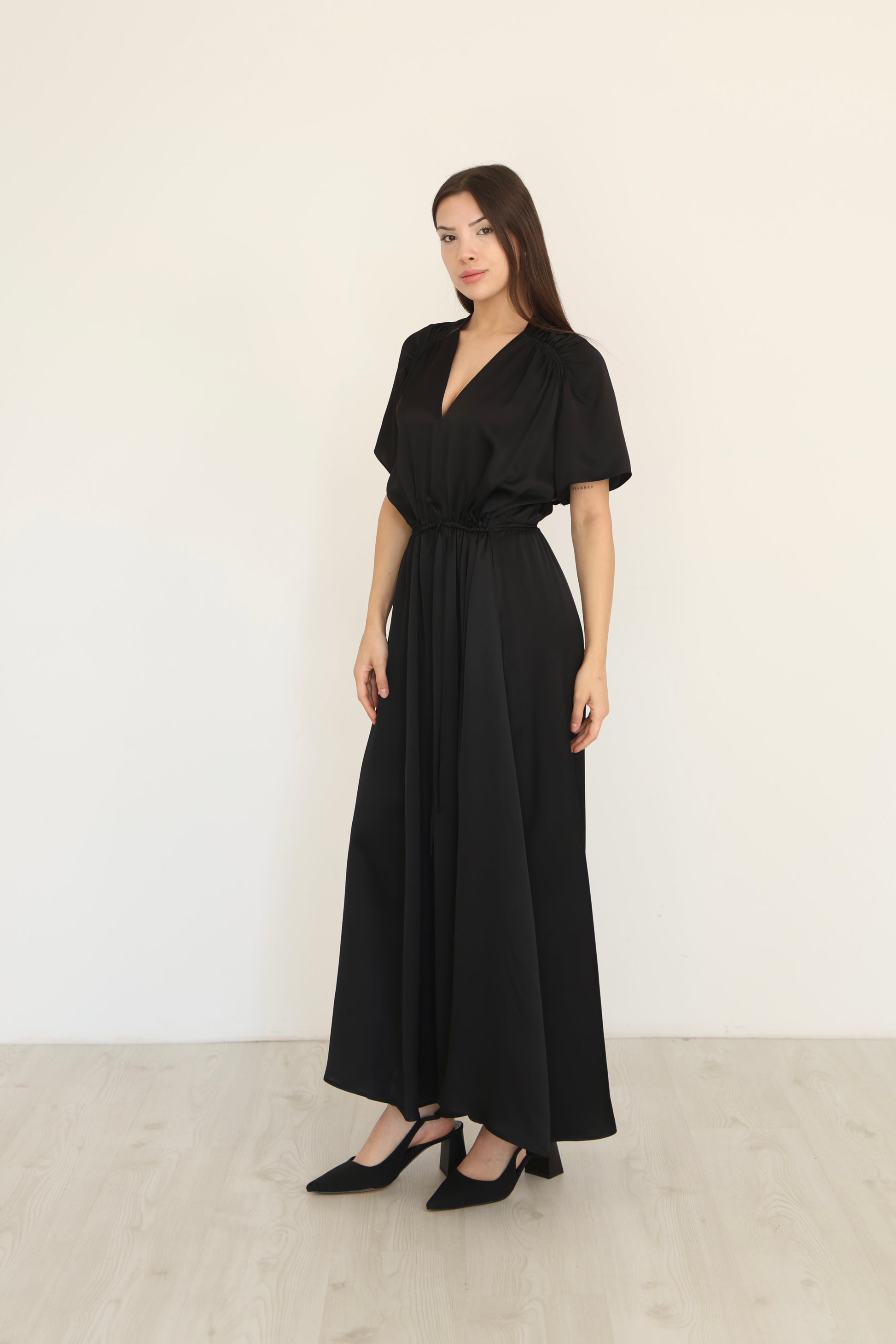 This black dress offers an elegant look with its V-neck design and drawstring waist. Its slit design completes your look while allowing for freedom of movement. The soft and lightweight viscose fabric offers comfort and breathability, ensuring all-day comfort. It's the ideal choice for both special occasions and everyday wear, adding a touch of distinction.