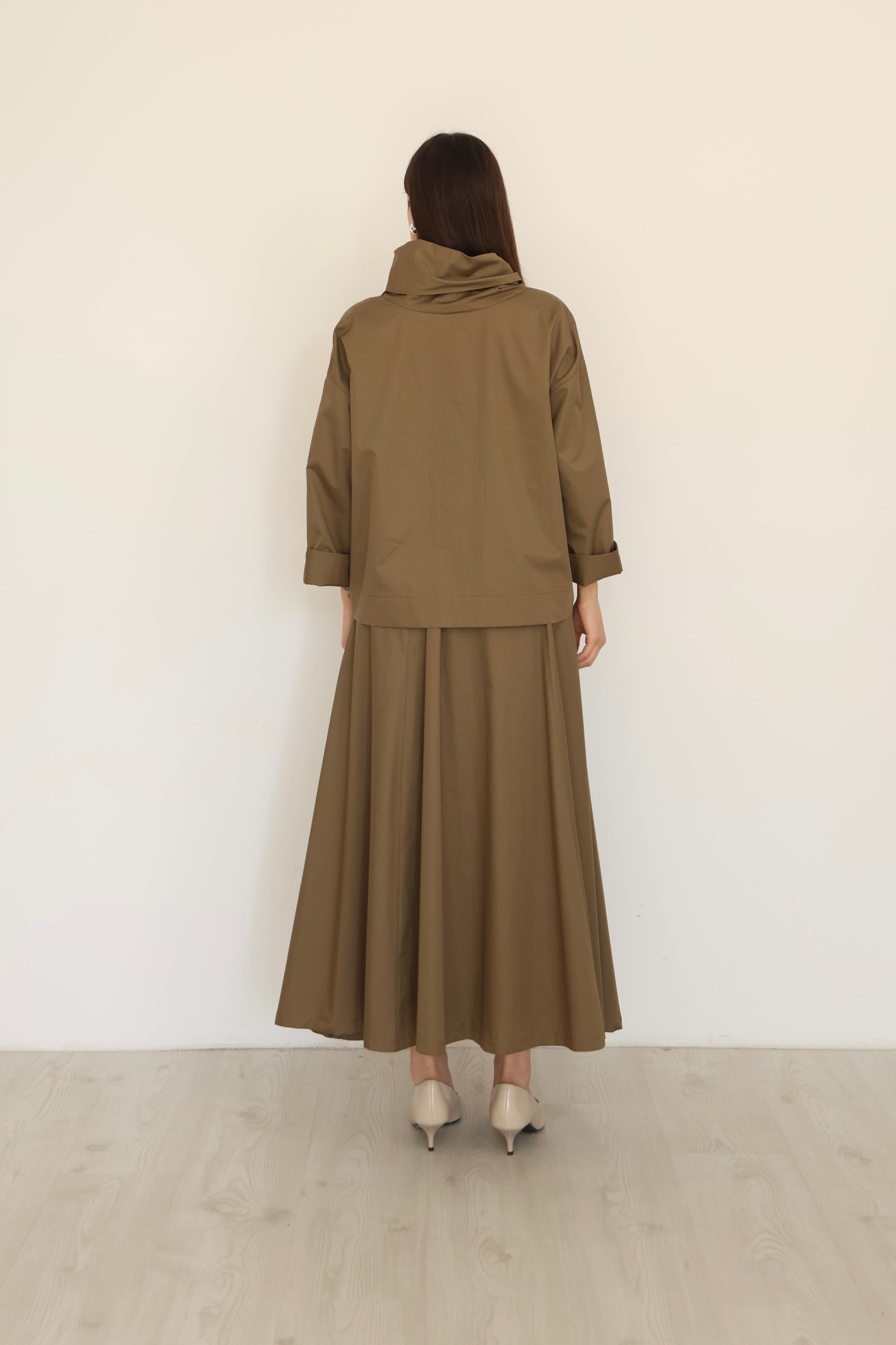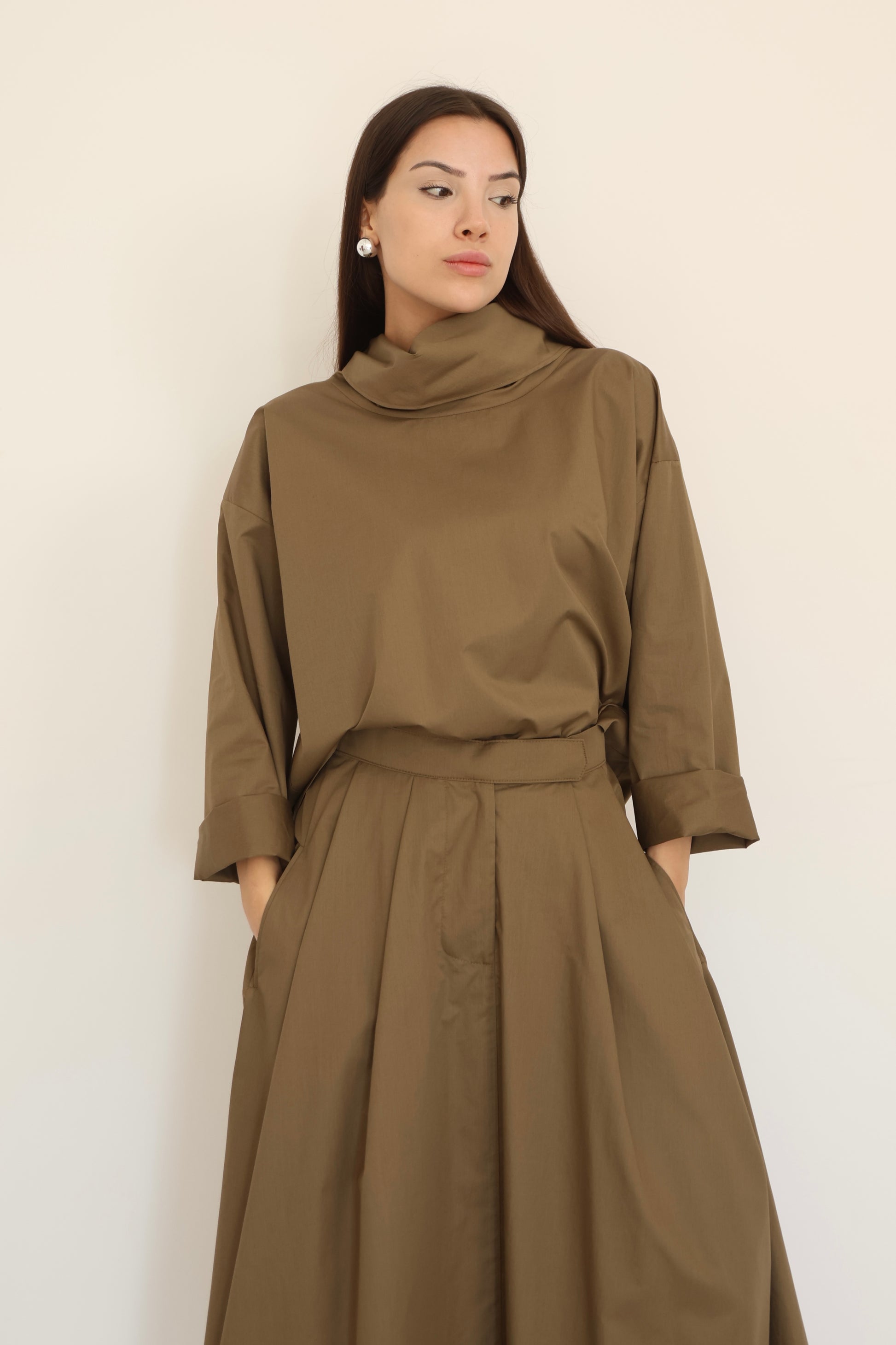 This dark green midi skirt in cotton offers both comfort and style with its breathable fabric and practical pockets. Its versatile haki shade pairs well with various outfits, making it an ideal choice for everyday wear. Designed for a flattering fit, this skirt combines functionality and a classic look suitable for multiple occasions.