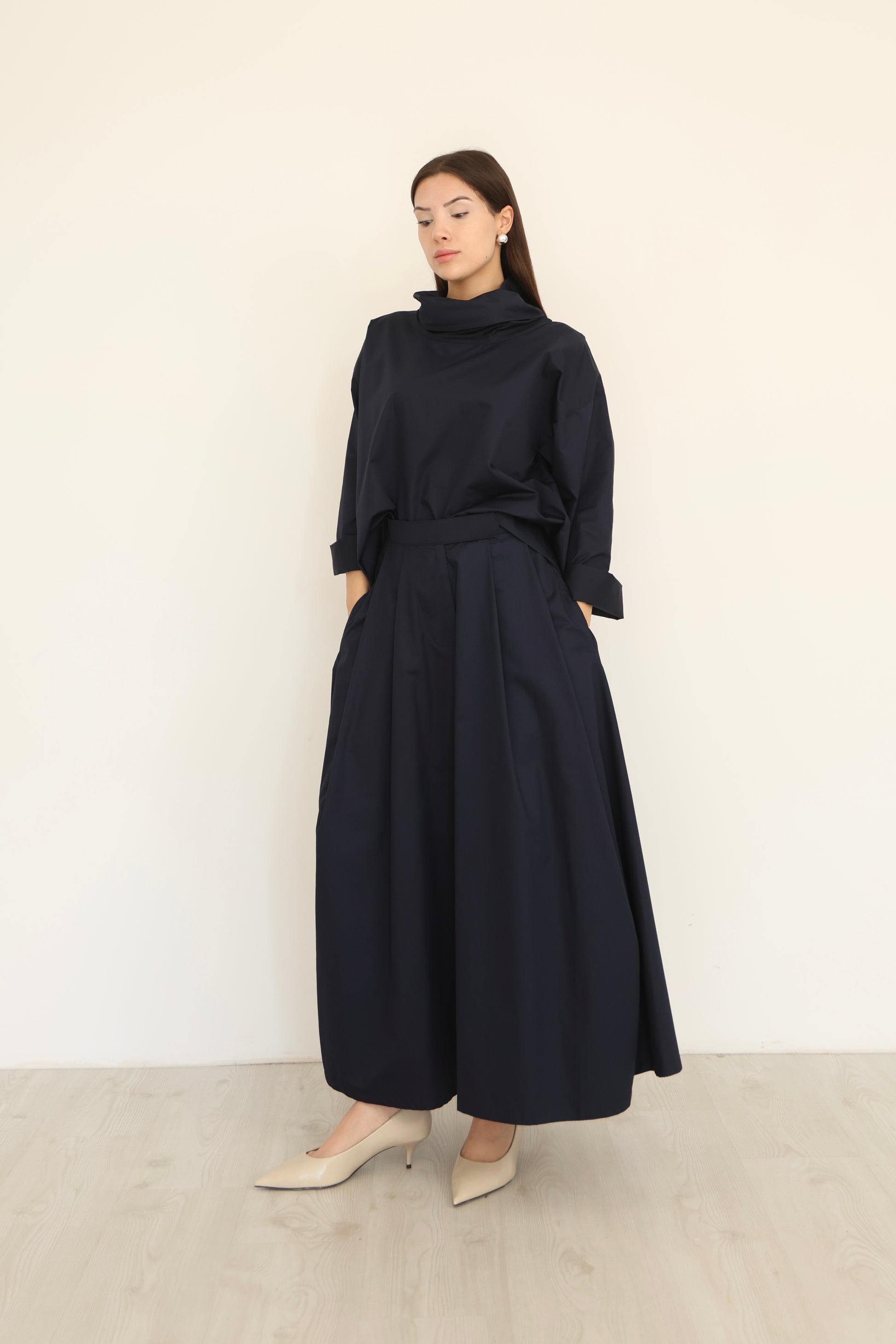 This navy blue midi skirt in cotton offers both comfort and style with its breathable fabric and practical pockets. Its versatile navy shade pairs well with various outfits, making it an ideal choice for everyday wear. Designed for a flattering fit, this skirt combines functionality and a classic look suitable for multiple occasions.
