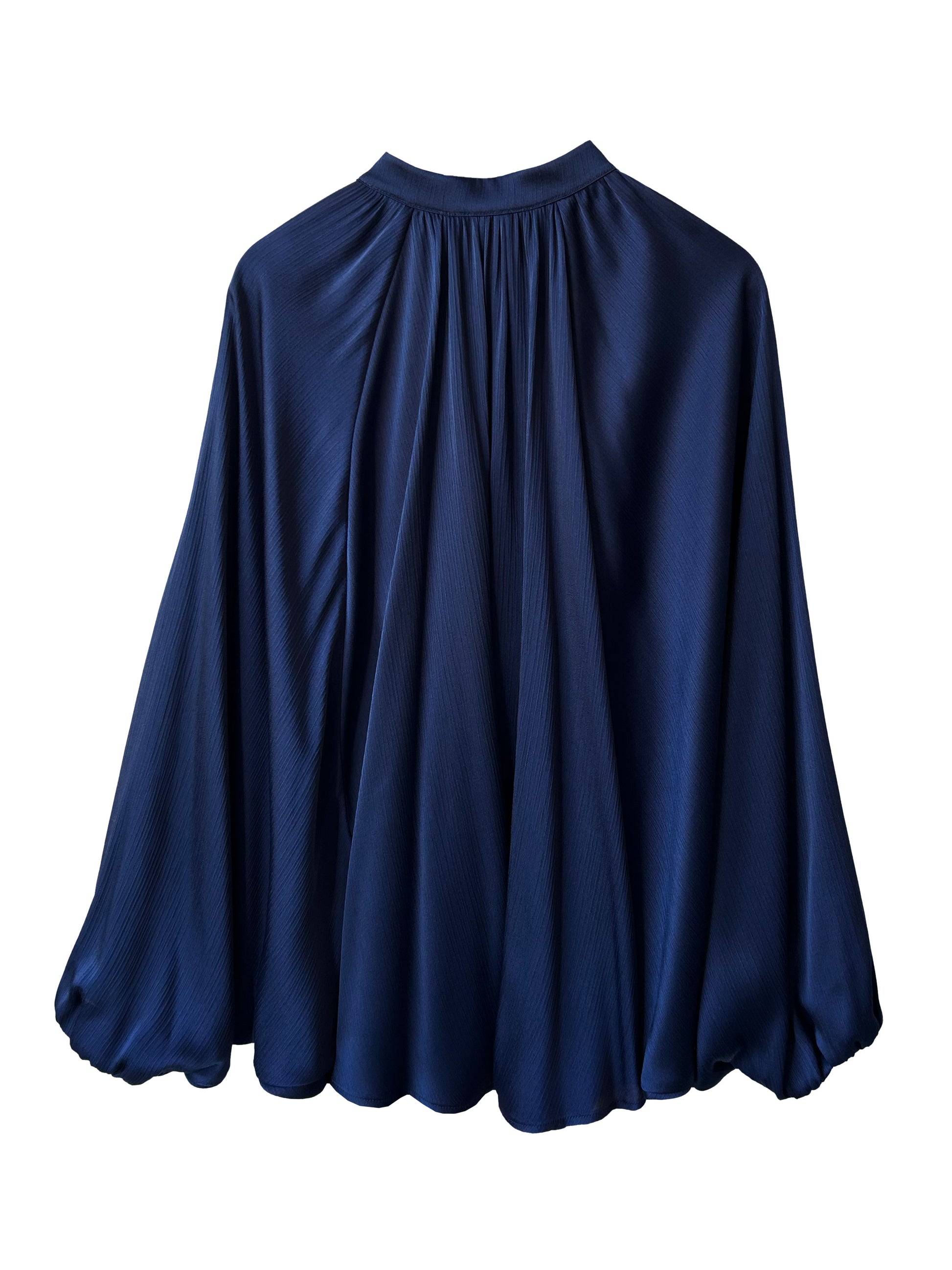 This long-sleeved blouse, featuring a subtle navy blue hue, adds a sophisticated touch to your look with its practical zipper collar and stylish drawstring details on the sleeves. Its comfortable cut keeps you comfortable all day long, while its unique design makes you stand out in any setting. Both stylish and functional, this blouse will become a wardrobe staple.
