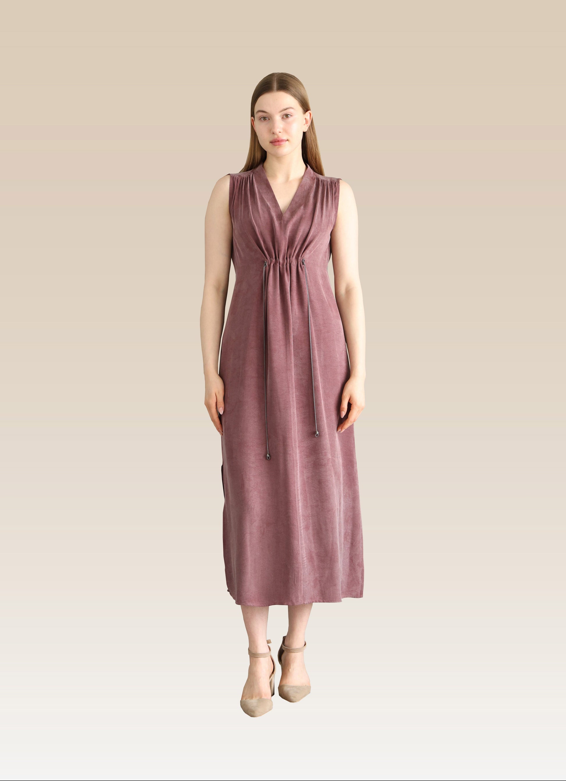 This strapless V-neck cupro fabric midi dress is a perfect choice for those looking for an elegant and modern elegance. The V-neck cut of the dress increases elegance by showing the neck long. Midi length offers an elegant stance and a suitable option for both daily use and special invitations. The adjustable drawstring (laced) detail at the waist of the dress can be shaped to fit the body comfortably. This feature allows you to customise the dress according to your personal preferences. Its lightweight and flowing fabric exhibits a natural drop in the body while also providing freedom of movement. Its simple but effective design is an ideal choice for those who are looking for a different comfortable and stylish look.